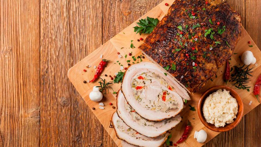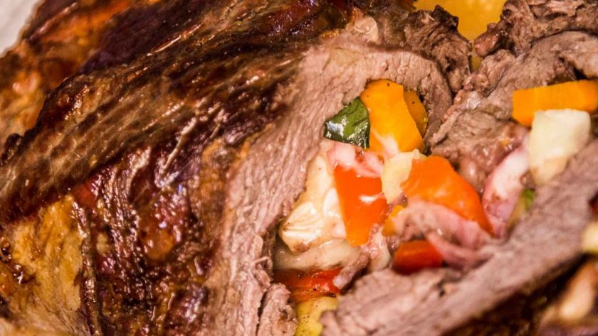 Una preparación gourmet donde la colita de cuadril se rellena con una mezcla de vegetales frescos, resultando en un plato jugoso y lleno de sabores naturales.
