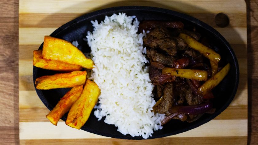 Una deliciosa mezcla de lomo tierno, cebollas, tomates y ajíes, salteados con salsa de soya y especias, representando la fusión de sabores peruanos y asiáticos.