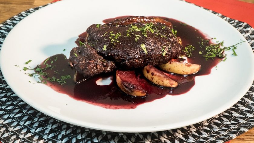 Bife de chorizo en reducción de vino tinto y peras
