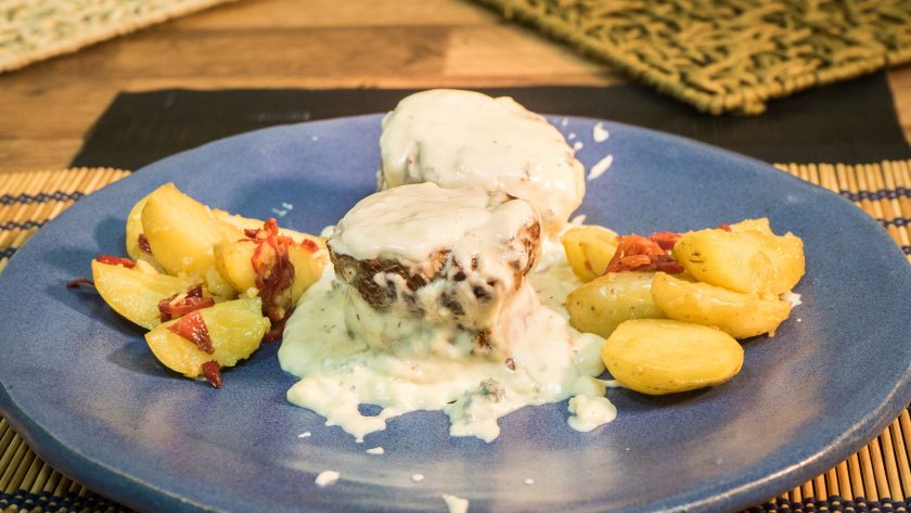 Medallón de lomito en crema de roquefort y papines picantes